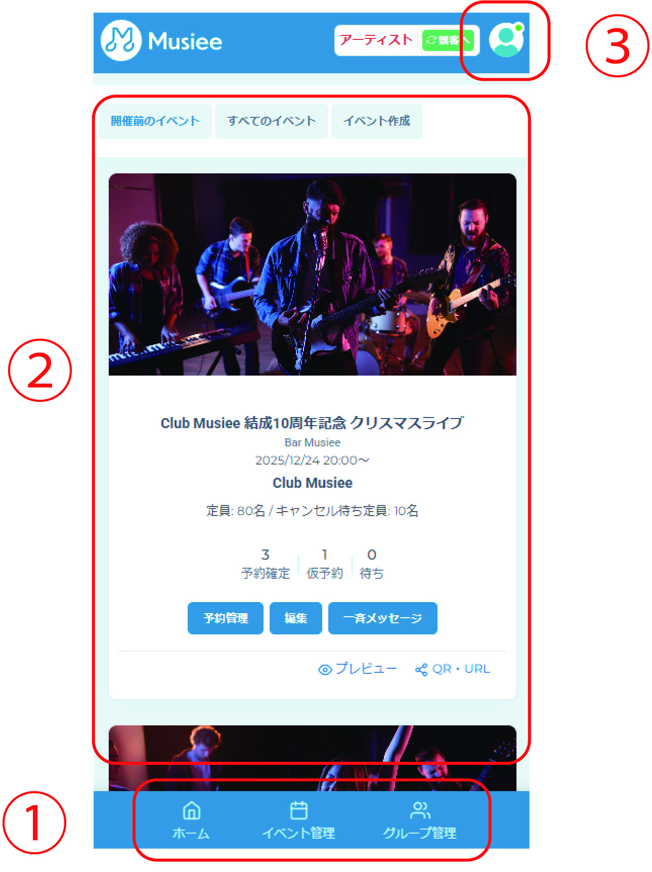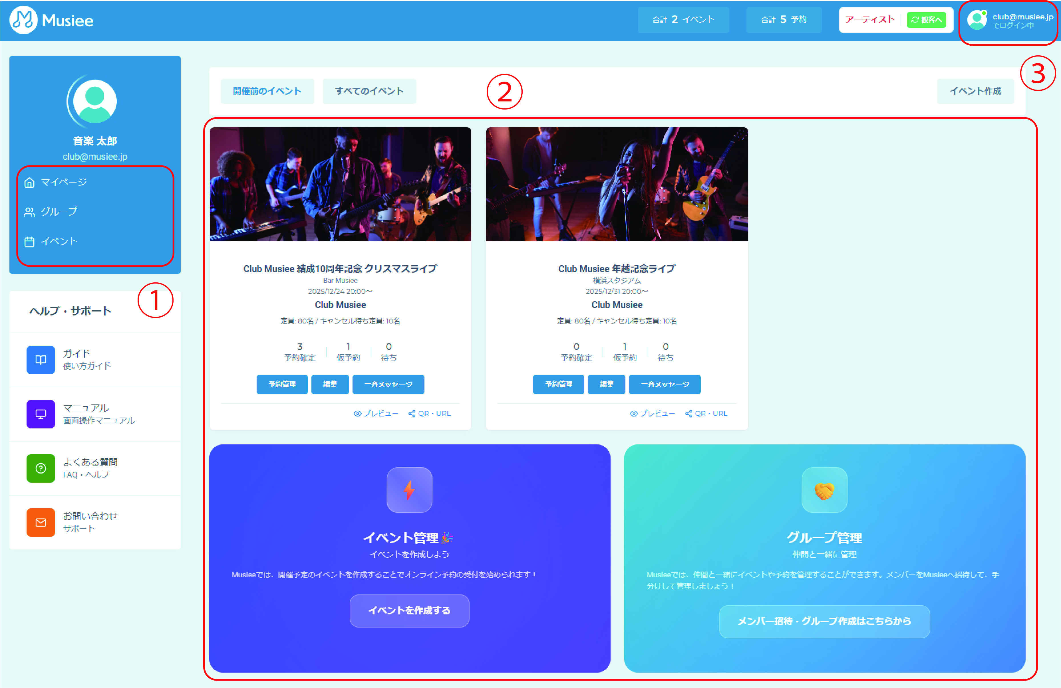 イベント管理、グループ管理等のメニュー