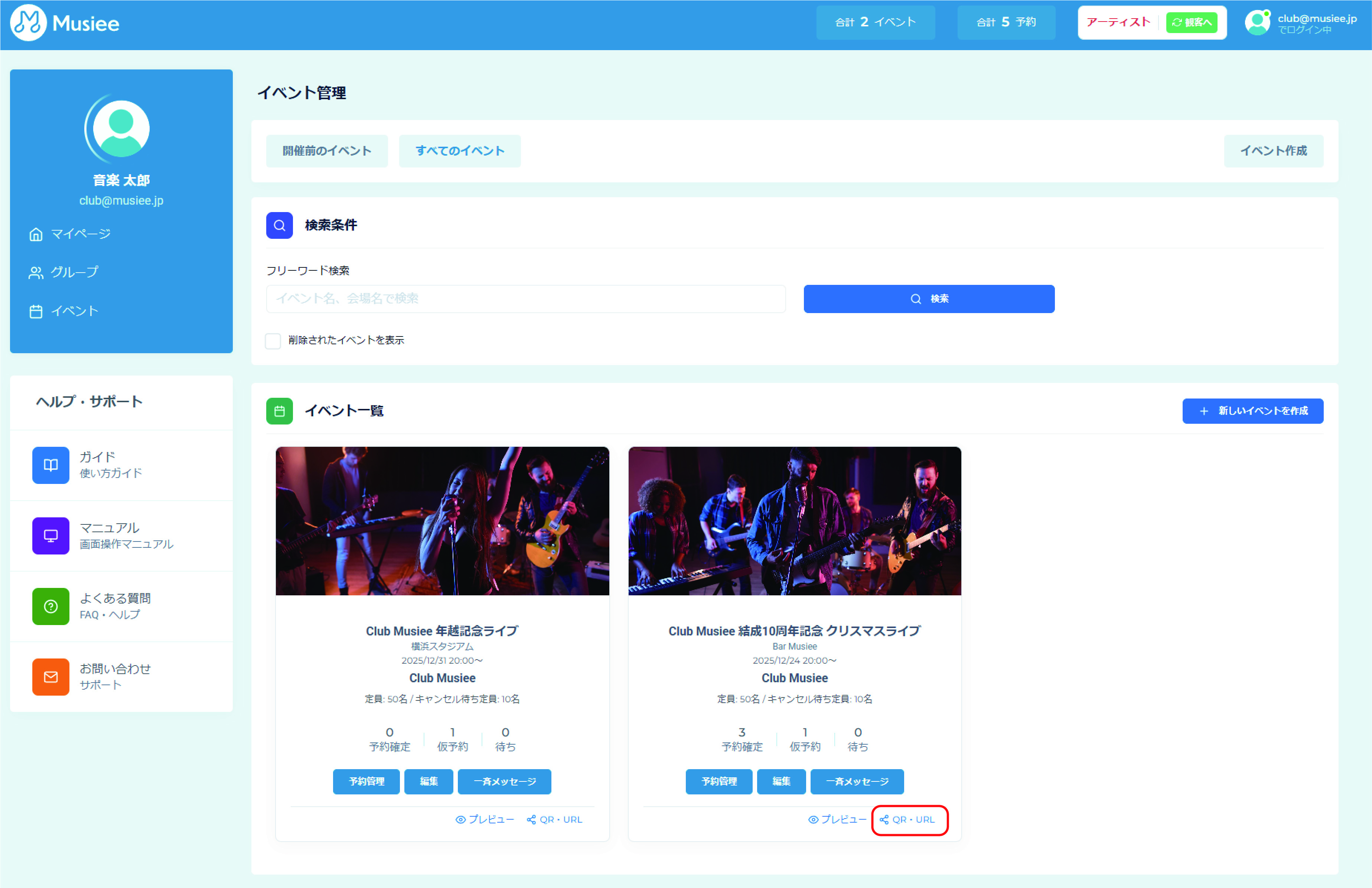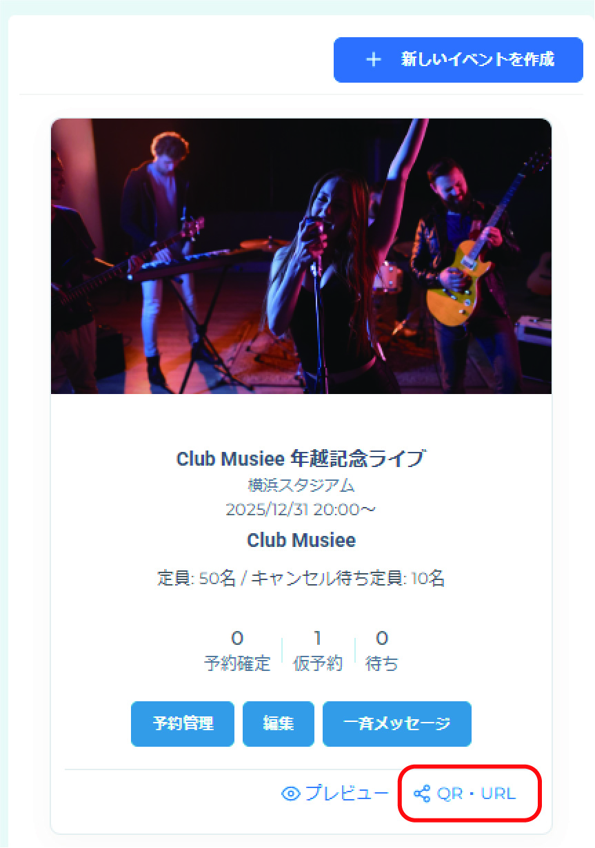 保存が完了するとイベント詳細画面が表示されます。「QR・URL」のボタンを選択します。