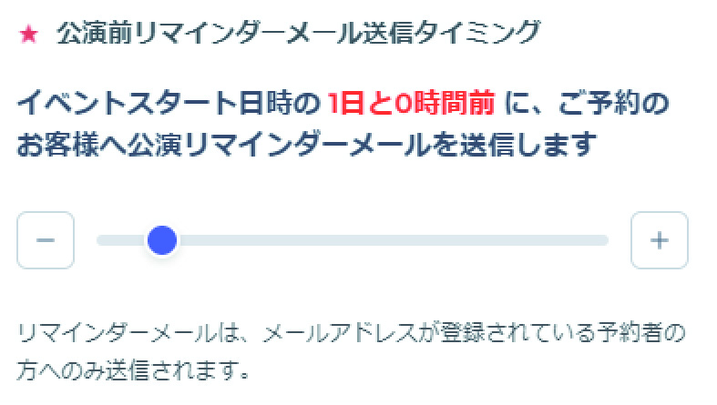 公演前リマインダーメール送信のタイミング設定します。(初期設定は24時間前)