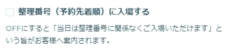 OFFにした場合、予約完了時の案内メールに「当日は整理番号に関係なくご入場いただけます」が記載されます。